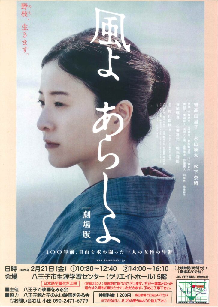 2025/02/17 【映画上映会「劇場版 風よ あらしよ」】 野枝、生きます。 100年前、自由を求め闘った一人の女性の生涯――。 ・2月21日(金) ・①10時半~12時40分 ②14時~16時10分 ・八王子市生涯学習センター5F ・定員240名(先着)、特別料金1200円 ・八王子で映画をみる会主催 https://www.kazearashi.jp/