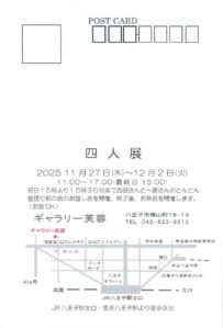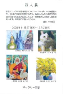 2025/11/27 【四人展】 教室ナカムラで絵画を嗜む4人のスーパーレディの作品展です。 初日15時より15時半まで吉田さんと一宮さんの「とんとんむかし語り部の会」のお話し会を開催、終了後、お茶会を開催します。 ・11月27日(木)~12月2日(火) ・ギャラリー芙蓉(八王子市横山町18-19)
