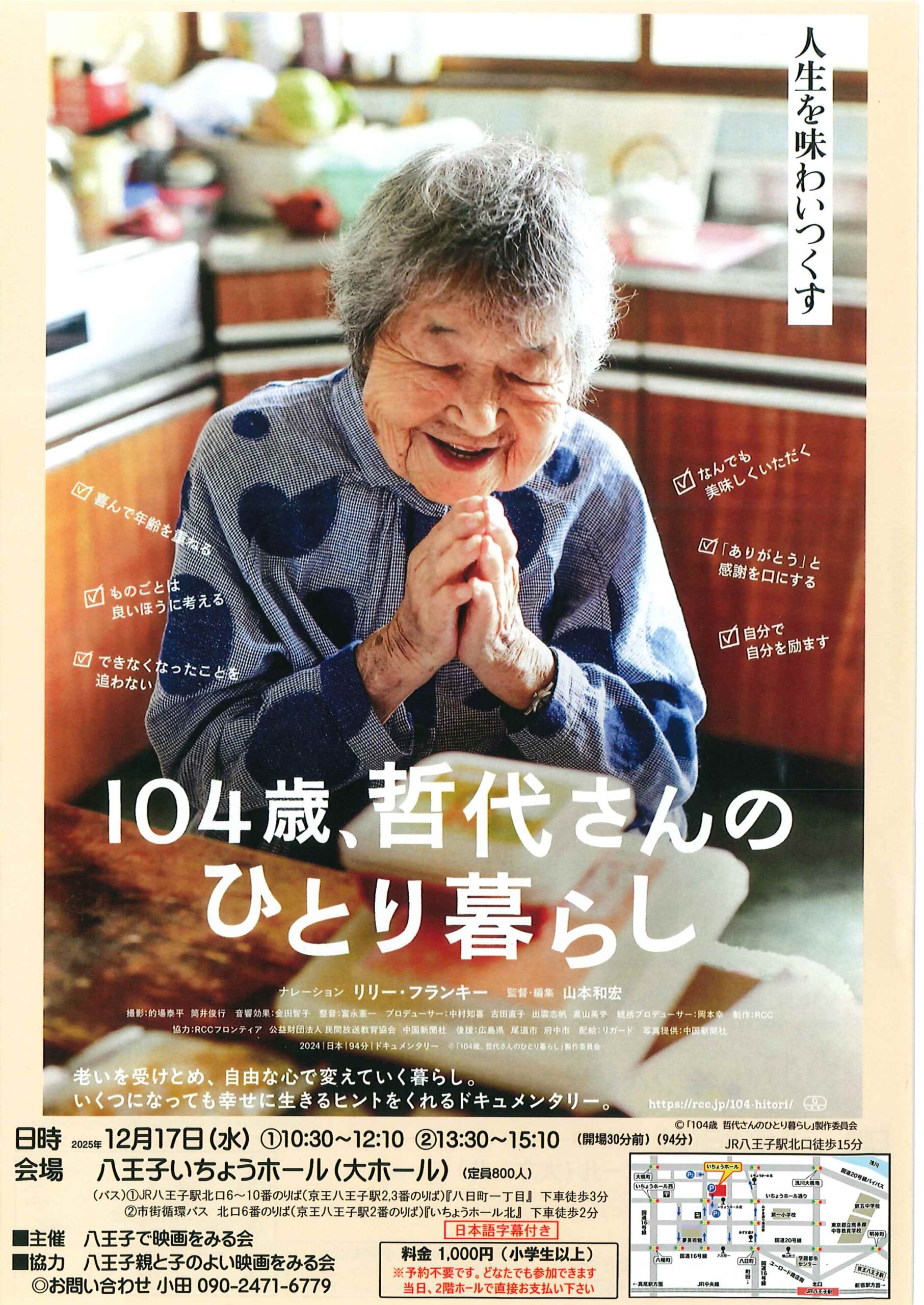2025/12/08 【上映会「104歳、哲代さんのひとり暮らし」】 老いを受けとめ、自由な心で変えていく暮らし。 いくつになっても幸せに生きるヒントをくれるドキュメンタリー。 ・12月17日(水) ①10:30~12:10 ②13:30~15:10 ・八王子いちょうホール ・定員800名、1000円(当日支払) ・八王子で映画をみる会主催