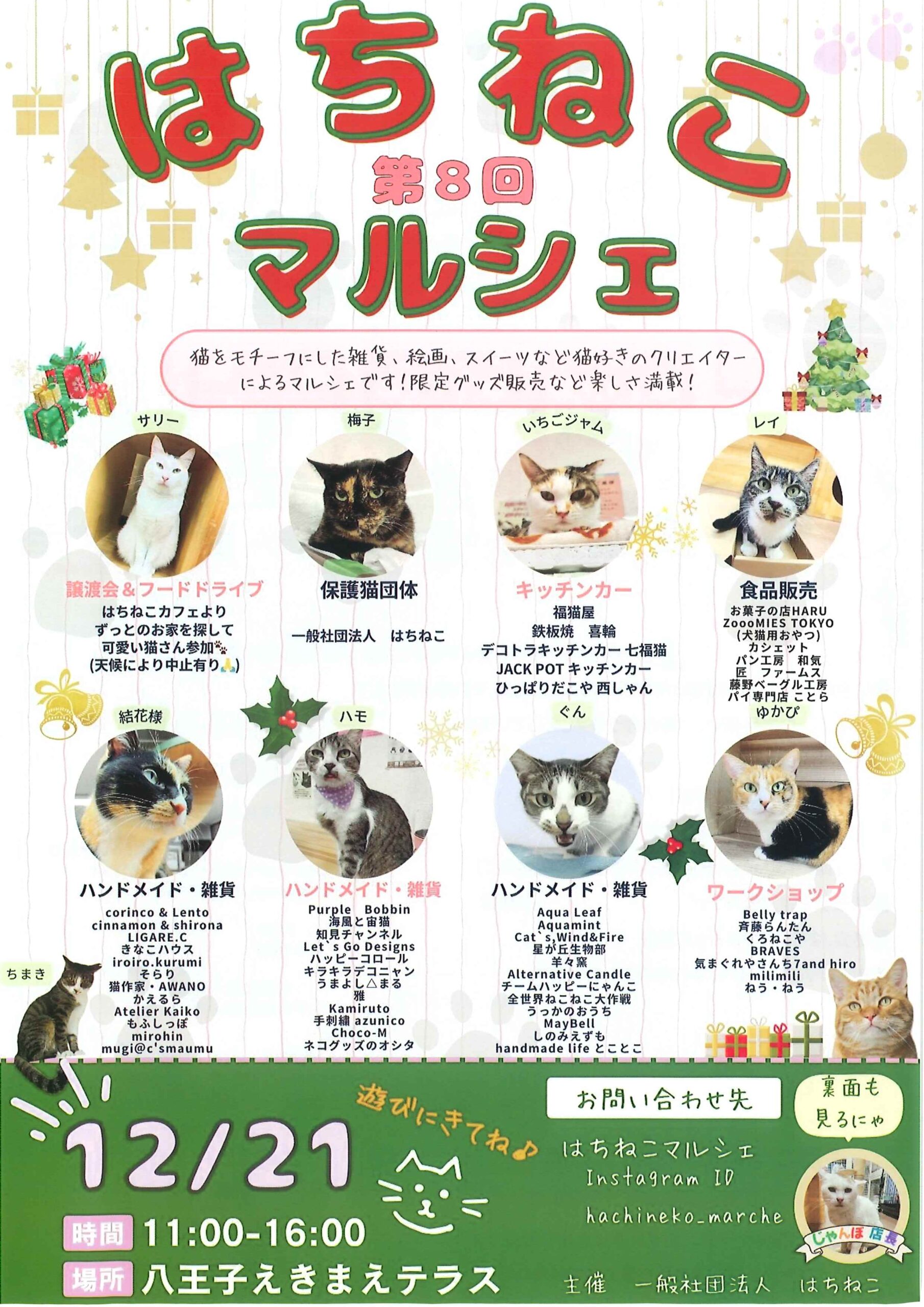2025/12/15 【第8回はちねこマルシェ】 猫をモチーフにした雑貨、絵画、スイーツなど猫好きのクリエイターによるマルシェです! 限定グッズ販売など楽しさ満載! ・12月21日(日)11時~16時 ・八王子えきまえテラス https://www.hachineko.com/%E4%BF%9D%E8%AD%B7%E7%8C%AB%E3%81%B1%E3%81%82%E3%81%8F-%E3%81%AF%E3%81%A1%E3%81%AD%E3%81%93%E3%82%AB%E3%83%95%E3%82%A7/