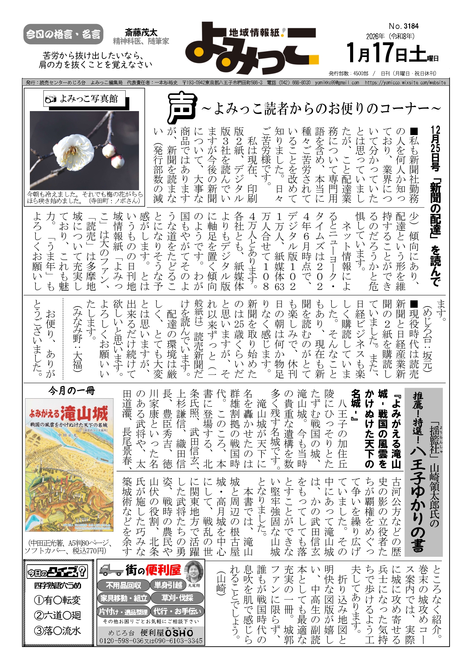 地域情報紙「よみっこ」に連載中の月一コラム「推薦! 特選! 八王子ゆかりの書」に『よみがえる滝山城』が登場。