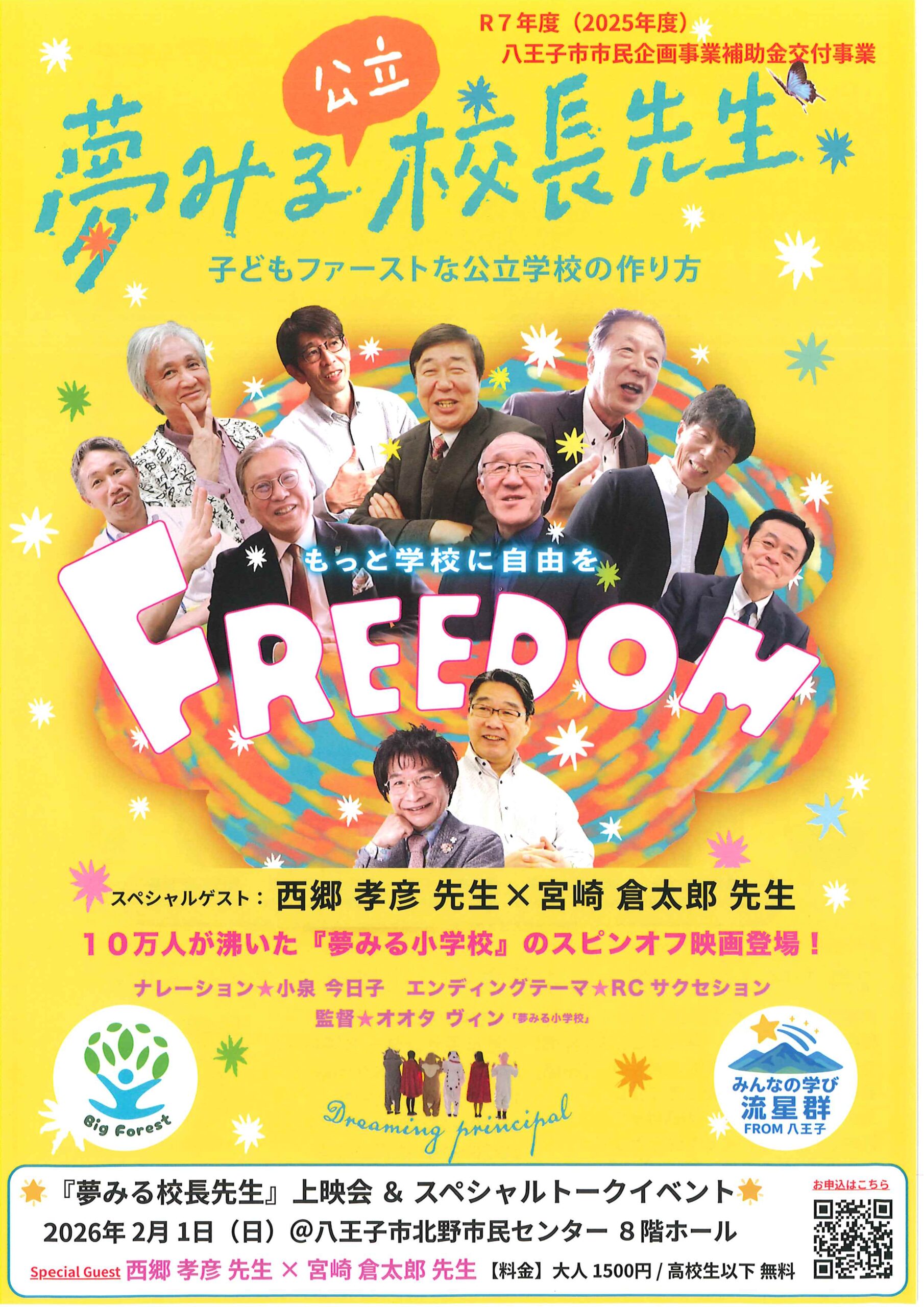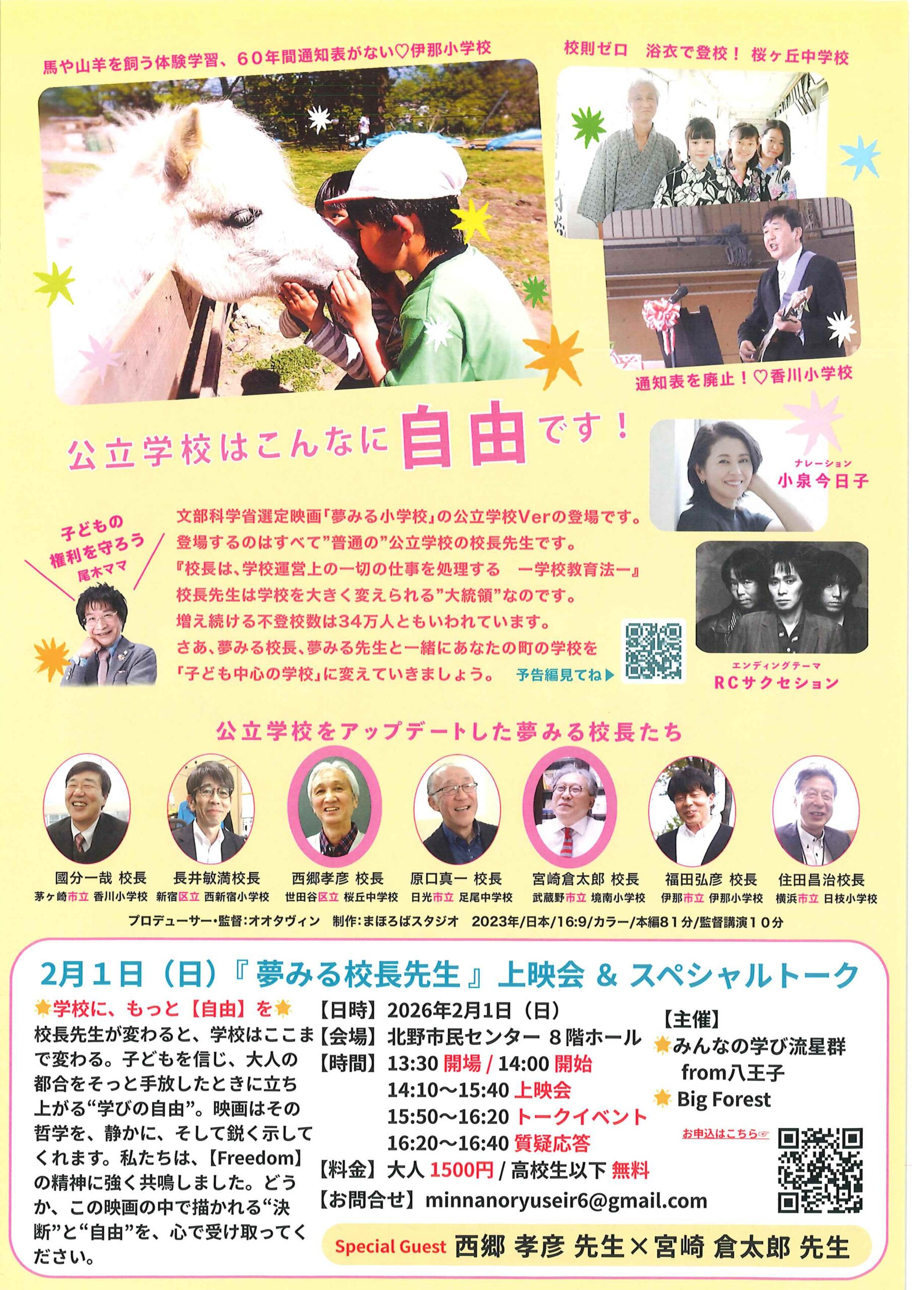 2026/01/23 【「夢みる公立校長先生」上映会&スペシャルトーク】 子どもファーストな公立学校の作り方! ・ゲスト 西郷孝彦先生×宮崎倉太郎先生 ・2月1日(日)13:30開場、14:00開始 ・北野市民センター8階ホール ・大人1500円、高校生以下無料 ・みんなの学び流星群from八王子主催 ・申込はチラシのQRから