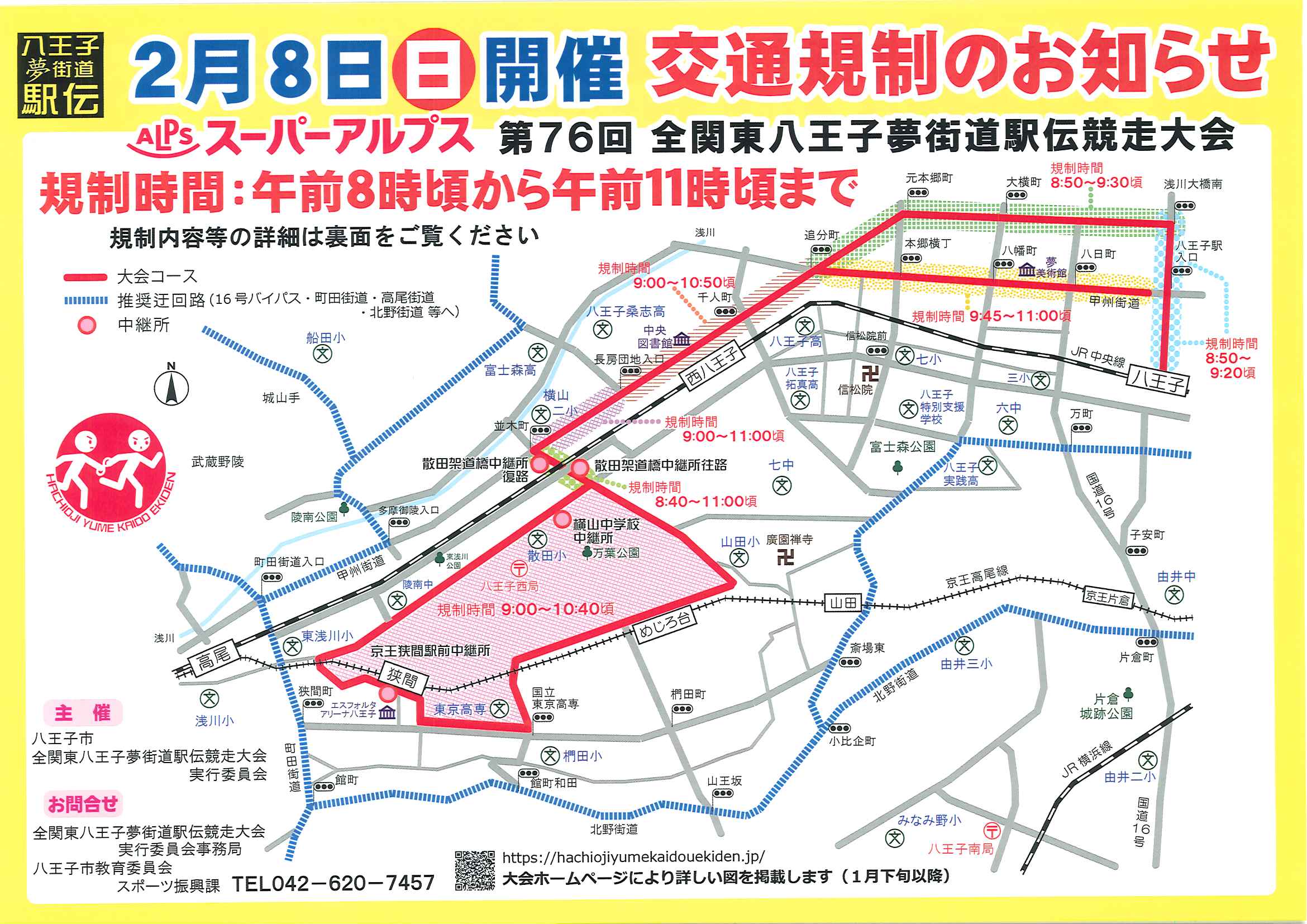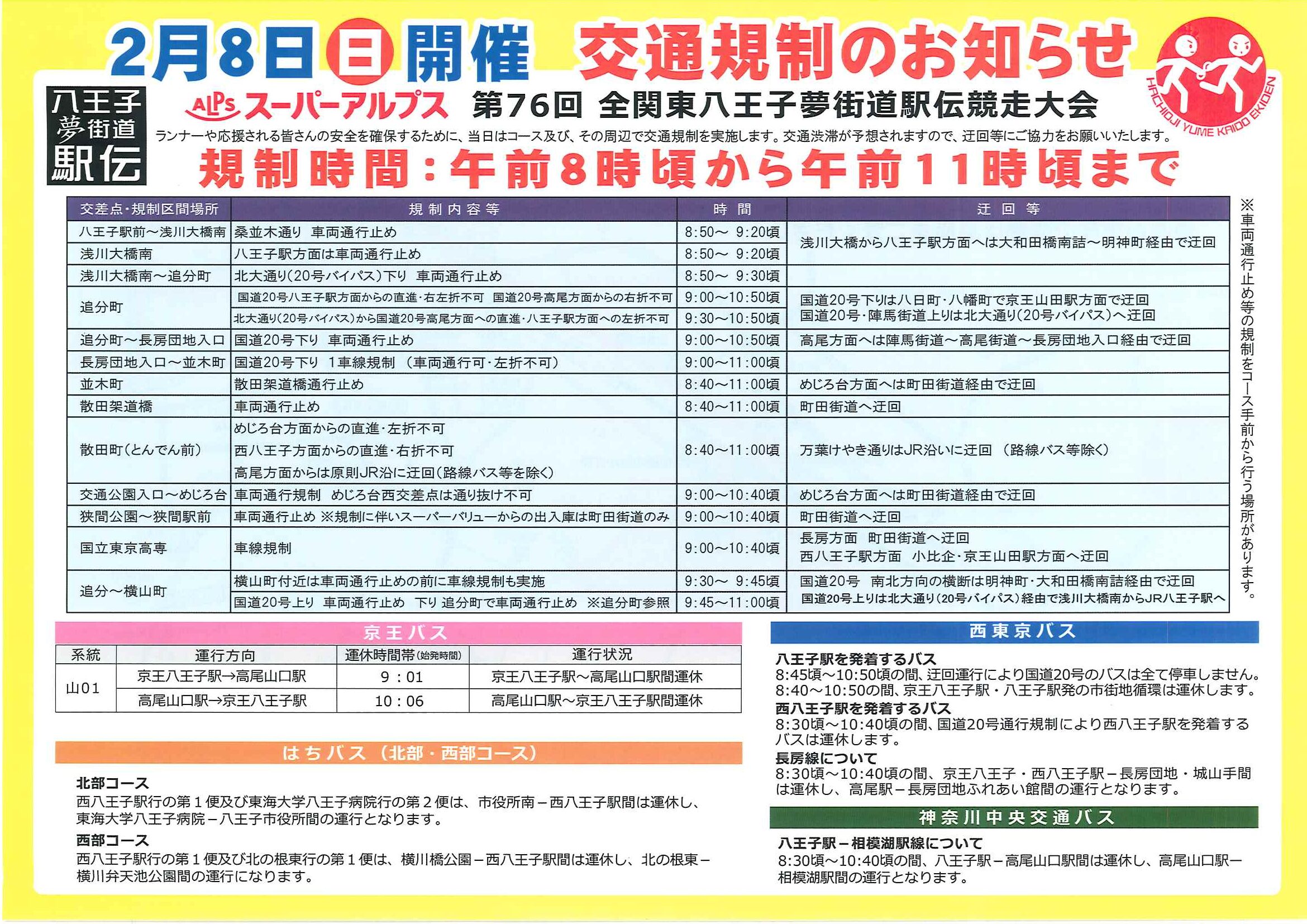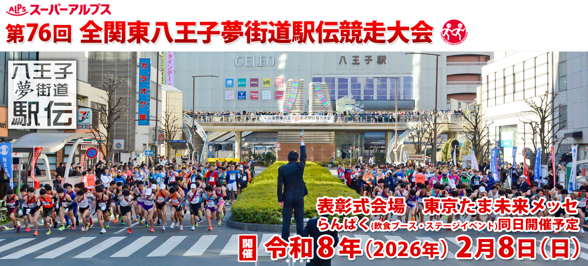 2026/01/30 【第76回全関東八王子夢街道駅伝競走大会】 今回で第76回を迎える歴史と伝統のある駅伝大会。八王子駅前をスタートし、中心市街地や甲州街道などを走ります。・2月8日(日)・八王子駅前など中心市街地※当日はバスの運休や通行止めなどがあるのでご注意を https://hachiojiyumekaidouekiden.jp
