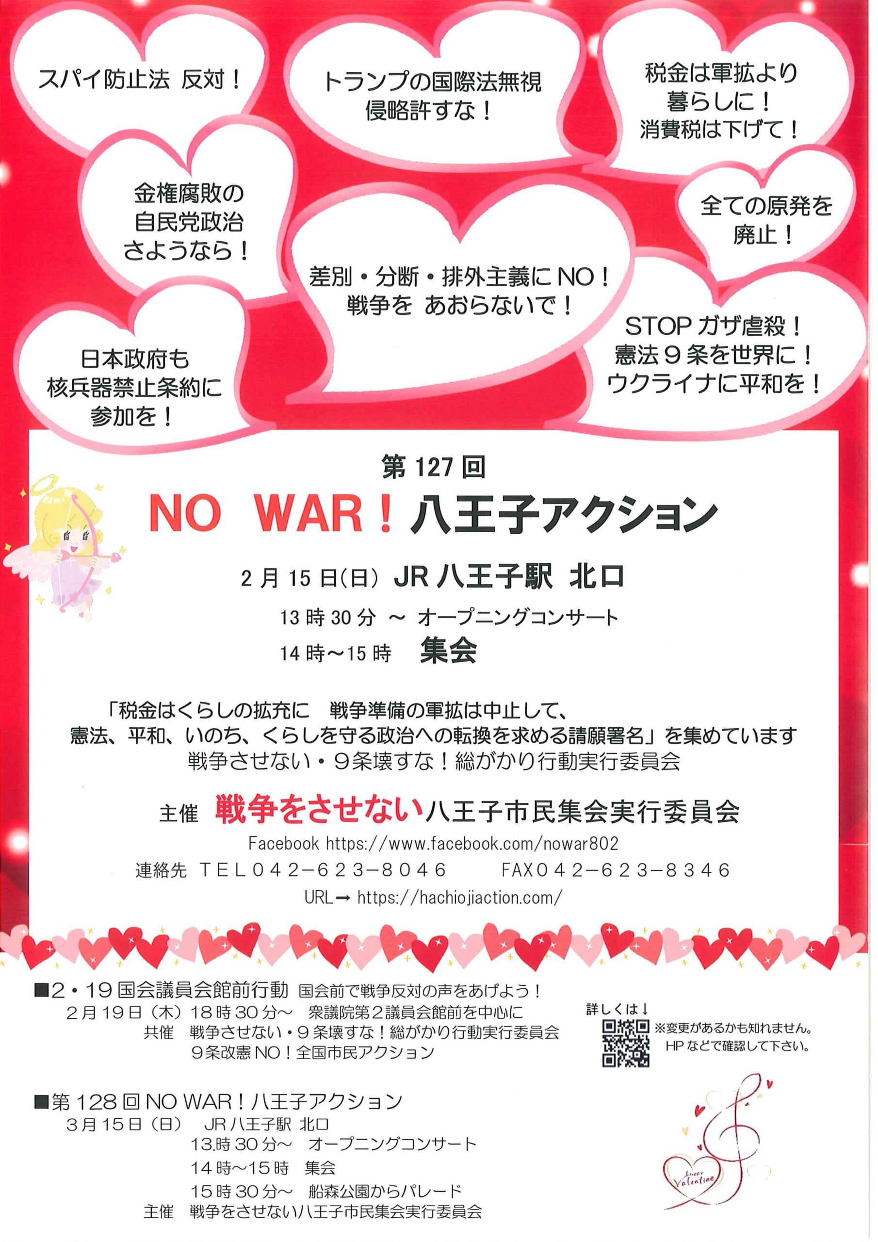 2026/02/03 【第127回 NO WAR! 八王子アクション】 ・2月15日(日)JR八王子駅北口 ・13時30分~ オープニングコンサート ・14時~15時 集会 ・戦争をさせない八王子市民集会実行委員会 ◎2.19 国会議員会館前行動(2月19日木18時30分~) ◎3.15 第128回NO WAR! 八王子アクション(3月15日日13時30分~)