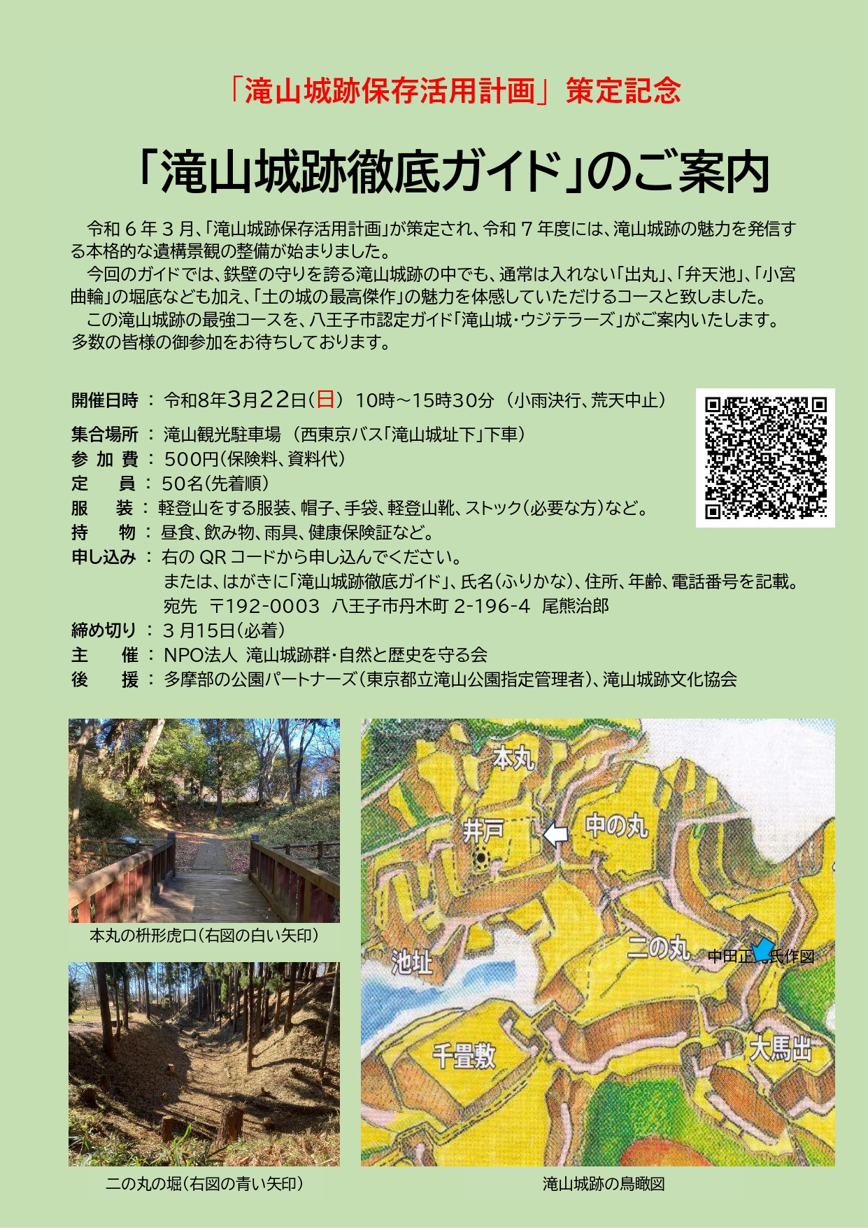 2026/02/19 【「滝山城跡保存活用計画」策定記念 「滝山城跡徹底ガイド」のご案内】 鉄壁の守りを誇る滝山城の中でも通常は入れない「出丸」「弁天池」「小宮曲輪」に挑みます。 ・3月22日(日)10時~15時半(小雨決行、荒天中止) ・滝山観光駐車場集合 ・参加費500円(保険料と資料代) ・申込はQRコードより