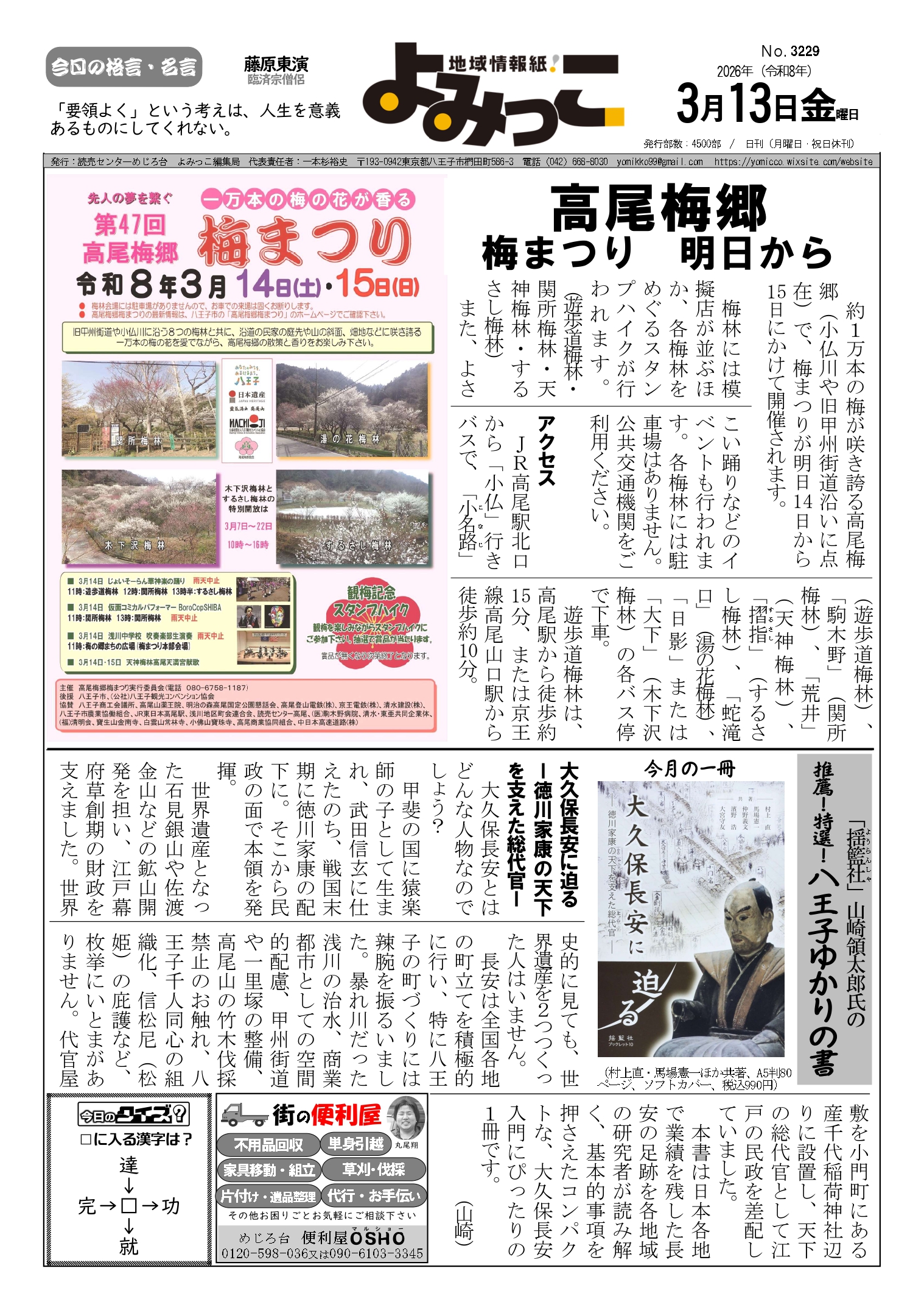 2026/03/16 【よみっこ連載に『大久保長安に迫る』】 地域情報紙「よみっこ」に連載中の書評コラム。 3月は『大久保長安に迫る』。 徳川家康のもと、江戸幕府初期に財政面で貢献した大久保長安の実像に、各地の研究者が迫った1冊。 鉱山開発や文化面での活躍など、多面的な大久保長安の姿を読み解く入門編です。
