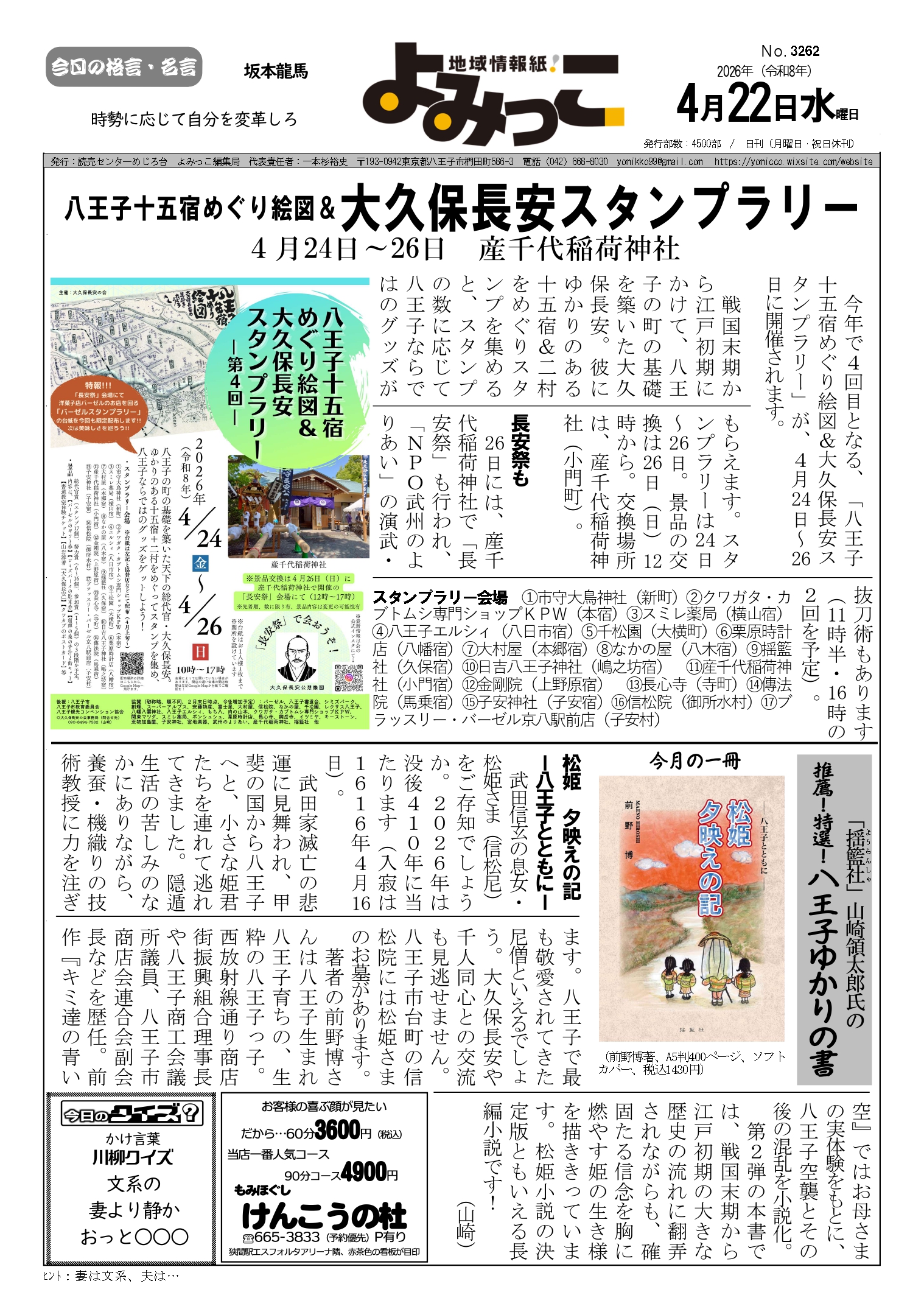 2026/04/23 【よみっこに「大久保長安スタンプラリー」】 今年で4回目を迎える #大久保長安 スタンプラリー(4月24日~26日)。 その記事が地域情報紙「よみっこ」に登場。 長安の町づくりや歴史の深い #八王子 の町を体感できるラリー。体力づくりにもうってつけ。 ※台紙配布先など https://www.google.com/maps/d/viewer?hl=ja&mid=1CPxOo44Kkhi1WWvY0QvjOm6rgk0ohHw&ll=35.6559248165777%2C139.3450546&z=13