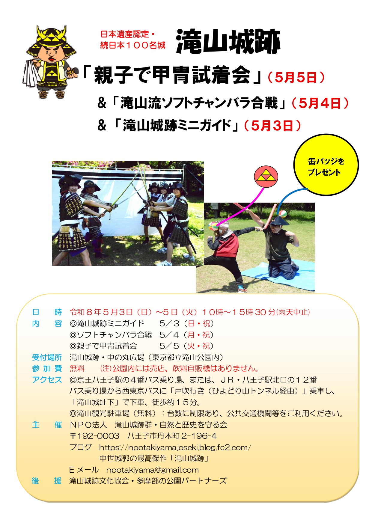 2026/04/30 【滝山城跡イベント情報!】 GWの人気企画を今年も実施。 親子で滝山城跡を攻略しましょう! ・3日(日)滝山城跡ミニガイド ・4日(月)ソフトチャンバラ合戦 ・5日(火)親子で甲冑試着会 ・滝山城跡中の丸広場 ・参加費無料 ・滝山城跡群・自然と歴史を守る会 https://takiyamajo.com/html/events.php